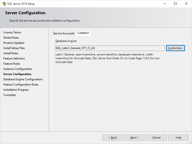 If you have some specific need for collation order, that is how strings shoud be sorted, you may want to take a look at the Collation tab. It has been pre-set from your computer's language and regional settings, and should be ok for you. Do not change that unless you are shure that you know what you are doing. There are a lot of different character sets, and SQL Server needs to know which one is valid for the data you want to put into the database. If you want to store text containing national characters, you know, those that has little dots, rings, accents above or hooks and stuff below, it is crucial that the SQL Server knows about them in order to sort strings correctly.