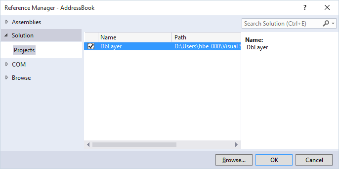 The Reference Manager opens. Here you can add references from four different sources, assemblies in the GAC (Global Assembly Cache, a place where Windows stores dll files), the current solution, from COM (Common Object Model a standard for defining objects) libraries and by browsing for dll files. We have the DbLayer in our solution, so we select 'Solution' and check the DbLayer file: