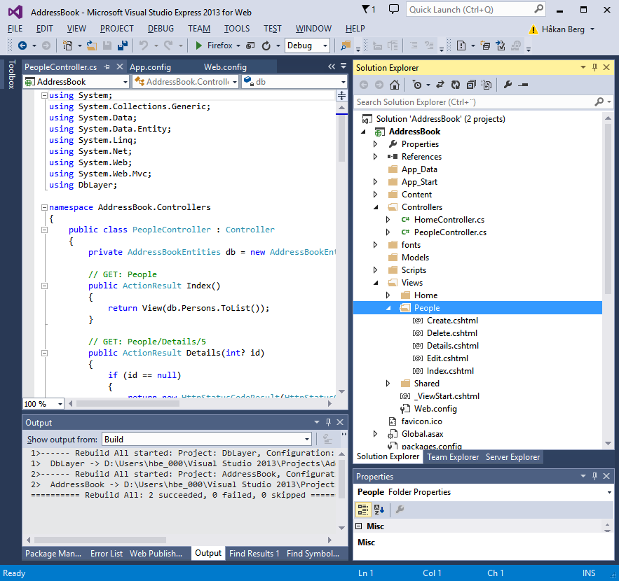 It is possible to create empty view and controllers independently, and write the needed code into them, but we are going to use a really cool feature of Visual Studio, 'Scaffolding'. We will tell it to create a CRUD for our Person table.